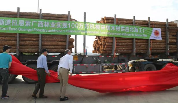 共同為第100萬方機(jī)采木材揭幕 斯道拉恩索是中國第一家實(shí)現(xiàn)全機(jī)械化采伐及營林的林業(yè)公司,也是這一行業(yè)的領(lǐng)軍人物。自2002年進(jìn)入廣西以來,斯道拉恩索就開始嘗試在廣西采用機(jī)械化森林經(jīng)營措施。先后引入了適應(yīng)廣西山多路陡的山地采伐機(jī)和平地采伐機(jī),并采用與之配套的集材機(jī)以提高集材歸堆效率。 2013年,斯道拉恩索開始全面采伐。2015年,隨著第一套絞盤牽引系統(tǒng)的引入,定長切割采伐機(jī)得以在超過45度的陡坡上開展作業(yè),克服了廣西林地以山地為主的難點(diǎn)。2015-2016年 從人工采伐轉(zhuǎn)向以機(jī)械化采伐為主。同年,為了確保對工廠的木材供應(yīng)設(shè)立了烏家貯木場。2016年12月9日,斯道拉恩索漂白化學(xué)機(jī)械漿生產(chǎn)線投產(chǎn)并開始向北海消費(fèi)紙板廠供應(yīng)紙漿,這同時(shí)也是斯道拉恩索林業(yè)木材供應(yīng)團(tuán)隊(duì)和木材處理中心工作人員之間密切合作和定期溝通的開始。 此外,斯道拉恩索還致力于營林機(jī)械化技術(shù)的創(chuàng)新發(fā)展。通過與關(guān)鍵承包商及林業(yè)機(jī)械設(shè)備供應(yīng)商的緊密合作,改良了源自歐洲的機(jī)械植苗管設(shè)備,大大提高了營林撫育的效率與質(zhì)量。斯道拉恩索在森林經(jīng)營機(jī)械化方面的經(jīng)驗(yàn)與成果得到了中國以及廣西林業(yè)行業(yè)的一致認(rèn)可,先后被選為世界自然基金會(WWF)、森林管理委員會(FSC)、國家桉樹中心等多家專業(yè)機(jī)構(gòu)的林地考察示范點(diǎn)。