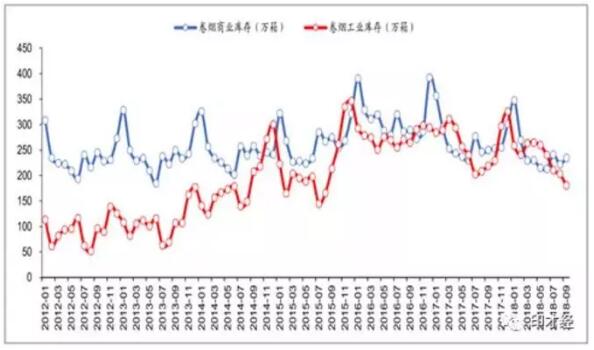 ▲中國包裝行業細分市場營銷占比 1、煙標:煙草去庫存初步完成,包裝需求向上 煙草去庫存初步完成,行業重新進入補庫存階段,包裝需求恢復向上。煙草產量對應煙標需求量。 (1)2013-2015年由于卷煙增產等因素導致市場供過于求,煙草工商業庫存(尤其是工業庫存)一度累積攀升,2016年煙草銷量大幅下滑,高庫存問題凸顯,行業進入去庫存階段,煙標需求受到抑制,煙標企業的業績增速有所減緩。 (2)根據煙草專賣局數據,截止2018年9月,卷煙工商業庫存降至415.45萬箱,大致回到2014年合理水平。