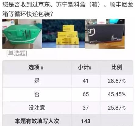 “可循環箱”使用率不高 除了快遞箱回收計劃,各大快遞、物流公司也紛紛試水,尋找新型材料代替傳統包裝。 2017年底,京東物流推出“青流箱”,采用100%可回收PP(聚丙烯)材質代替紙箱,并用自帶鎖扣代替封箱膠帶。 蘇寧物流在全國范圍內投放了40多萬只共享快遞盒,一年至少能節約4000萬個紙箱。還推出二維碼共享快遞盒,替代電子面單。 他們算了一筆賬:共享快遞盒的平均成本在15元左右,約為傳統紙箱的10倍。但一個循環快遞盒可使用40次以上,循環下來總成本相比傳統紙箱成本節省70%。 2018年6月,順豐推出了豐BOX循環包裝箱,以尼龍布為主,并用拉鏈代替封箱膠紙。目前,順豐已投入數十萬個豐BOX,總使用次數達數百萬次,平均單個循環使用接近10次,單體箱子最高使用次數已達42次,共減少碳排放約1600 噸。 但是,這些替代包裝推行一兩年來,滲透率、周轉速度遠遠跟不上傳統包裝。北京某京東物流站點負責人表示,他們站點日單量在3000單左右,青流箱的使用每日多則30、40次,少則只有1、2次,甚至沒有。618、雙11大促期間,由于訂單數量太大,京東青流箱停止使用。 在143位調查問卷用戶中,收到過替代包裝物的不足30%。