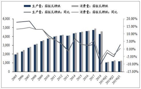 圖表來源:東吳證券研究所 箱板瓦楞2019年產銷量轉好。板瓦楞的生產量在2018年度首次出現負增長,其中箱板紙的表觀生產量2145萬噸(-10.06%)、瓦楞紙的表觀生產量2105萬噸(-9.85%),但自19Q1以來同比數據已經逐季出現轉好,尤其2019Q3以來出貨量回升,說明下游需求出現企穩。 箱板瓦楞紙生產量及表觀消費