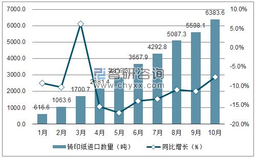 2019年1-10月中國轉印紙累計進口數(shù)量及增速趨勢圖