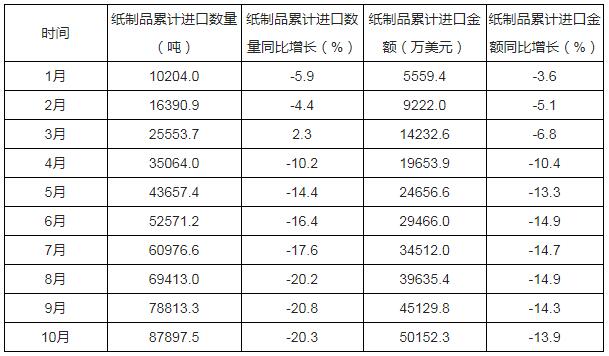 根據中國海關數據顯示:2019年1-10月紙制品進口數量為87897.5噸,同比下降20.3%;2019年1-10月紙制品進口金額為50152.3萬美元,同比下降13.9%。