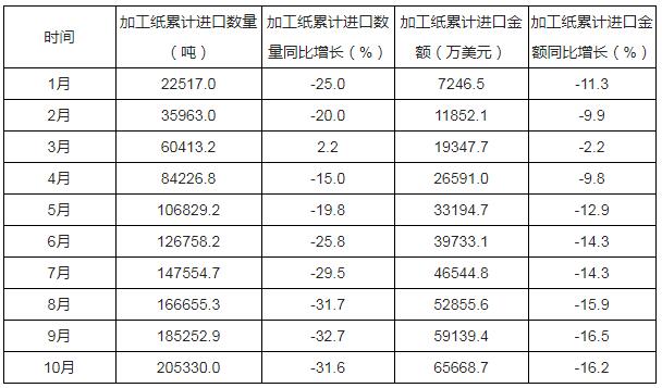 根據中國海關數據顯示:2019年1-10月加工紙進口數量為205330噸,同比下降31.6%;2019年1-10月加工紙進口金額為65668.7萬美元,同比下降16.2%。