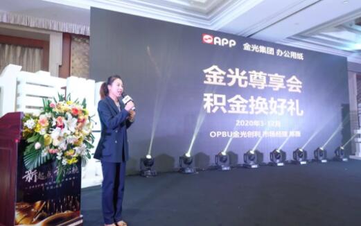 APP(中國)大紙事業部市場總監臧慧敏先生分享 《金光尊享會》活動介紹 2020年,APP辦公用紙將推出標志性終端活動—《金光尊享會》,市場部經理陳薇女士介紹:“APP將通過積“金”換好禮形式,以新技術為載體,觸及終端用戶,增加消費者粘性,為APP與客戶共同發展創造新的契機。”