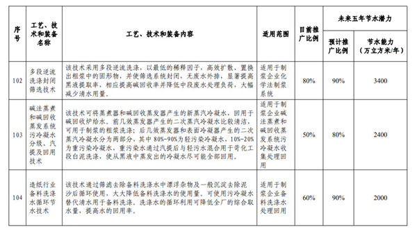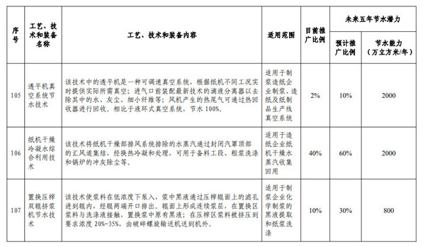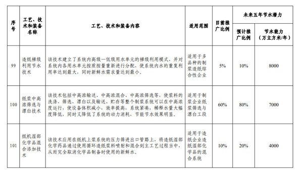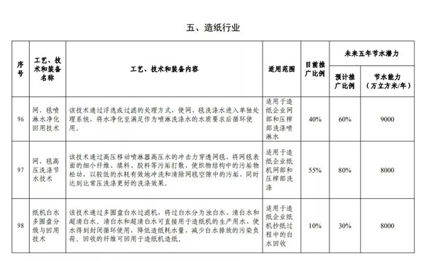 眾所周知,造紙行業用水量,占工業總用水量的4%左右,具有成分復雜、難處理物質含量較高等特點。 為促進行業節水減污,《國家鼓勵的工業節水工藝、技術和裝備目錄(2019年)》共遴選了造紙行業13項節水技術裝備,如網毯高壓洗滌節水技術、造紙梯級利用節水技術等。 公示信息 為貫徹落實《國家節水行動方案》,加快工業高效節水工藝、技術和裝備的推廣應用,提升工業用水效率,促進工業綠色發展,工業和信息化部、水利部編制完成了《國家鼓勵的工業節水工藝、技術和裝備目錄(2019年)》,F予公告。 造紙業13項節水技術裝備