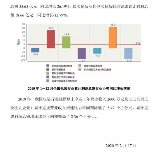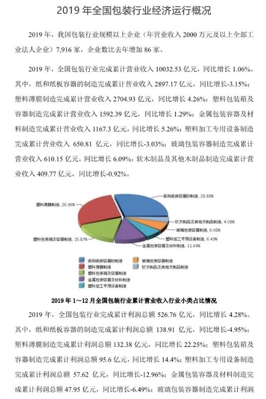 日前,中國包裝聯合會公布了2019年包裝行業經濟運行概況。2019年,我國包裝行業規模以上企業(年營收2000萬及以上工業法人企業)為7916家,企業數比去年增加86家。 全國包裝行業完成累計營業收入10032.53億元,同比增長1.06%,其中紙和紙板容器制造完成累計營業收入2897.17億元,同比減少3.15%。 全國包裝行業完成累計利潤總額526.76億元,同比增長4.28%,其中紙和紙板容器制造完成累計利潤總額138.91億元,同比減少4.95%。 包裝行業規模以上企業累計完成營業收入增速比去年同期降低了5.47%,累計完成利潤總額增速比去年同期增加了2.36%。 2019年包裝行業經濟運行概況