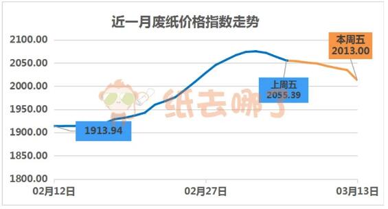 上周,廢紙價格“大跳水”,降價的范圍、幅度越來越大,甚至出現一日多次降價的情況。幾家大廠更是一馬當先,領頭降價。截至3月13日(上周五)上午,廢紙價格指數為2013.00點,相比前一周周五的2055.39點,下跌42.39點。 02、山鷹系A級收購價格走勢