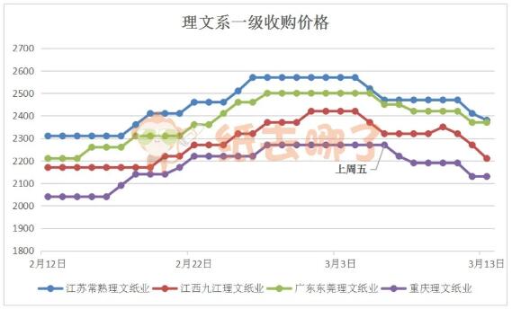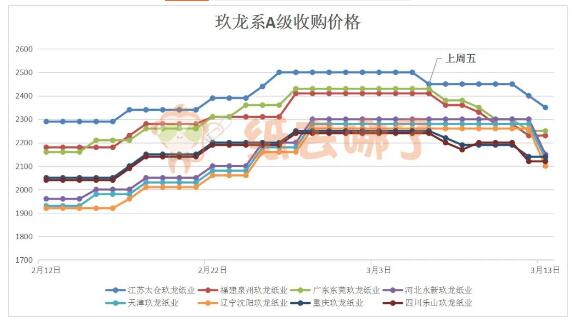 上周理文系一級紙收購價格下跌,幾家理文均多次下調紙價。截至3月13日上午,江蘇、江西、廣東、重慶理文總體上分別下調90、110、80、140元/噸。理文系一級紙以江蘇理文最高,為2380元/噸;重慶理文最低,為2130元/噸。 04、玖龍系A級收購價格走勢