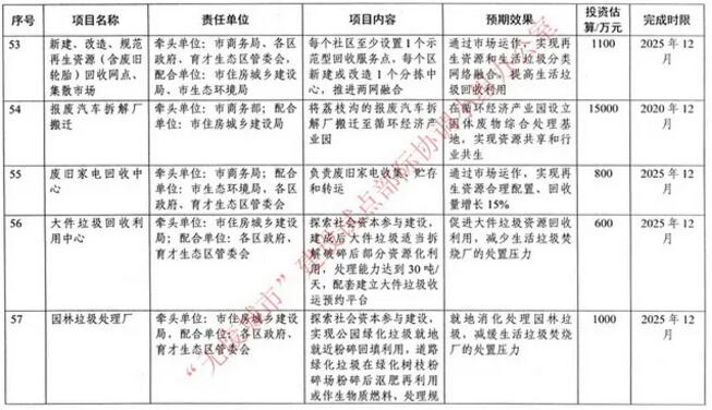 三亞市“無廢城市”工程建設項目清單及進度安排(部分)。資料來源:三亞市“無廢城市”建設試點實施方案 重慶市表示,將建立多元化、多層次的資金投入保障體系。市級財政落實市級層面“無廢城市”建設試點工作經費保障,將相關經費納入預算。市級有關部門對接國家部委,爭取國家資金支持。重慶市主城區政府(管委會)加強“無廢城市”建設試點工作的資金投入,結合生活垃圾收運處理設施、污水污泥處置設施、建筑垃圾消納設施等重點工程建設,加大財政資金統籌整合力度。創新重點領域固體廢物投融資機制,建立循環經濟融資平臺,加強政、銀、企信息對接,引導和鼓勵社會資本加大對固體廢物處理處置設施投入力度。 北京經濟技術開發區的方案則提出,到2025年,開發區“無廢城市”建設模式在“亦莊新城”范圍內全面鋪開,落地一批先進的固體廢物處理工程設施,基本實現依靠區內基礎設施處理處置固體廢物問題,初步實現園區趨零排放。創新融資方式,支持社會資本參與、發行綠色債券,擴展綠色發展資金項目等,用于支持固體廢物源頭減量、資源化利用和安全處置體系建設。 根據紹興市的方案,該市將重點培育一批市級綠色工廠和綠色園區,持續打造一批綠色設計產品。2020年12月底前,累計實施國家級綠色制造系統集成項目、創建國家級綠色制造名單15個以上;創建市級以上綠色工廠49家;創建市級以上綠色園區、循環化改造園區8家。以動力電池、電器電子產品、汽車、鉛酸蓄電池等為重點,落實生產者責任延伸制,到2020年12月底,基本建成廢棄產品逆向回收體系。 在要素投入方面,紹興市表示,將加強財政資金統籌整合,明確“無廢城市”建設試點資金范圍和規模。將固體廢物分類收集及無害化處置設施納入城市基礎設施和公共設施范圍,保障設施用地。鼓勵金融機構在風險可控前提下,加大對“無廢城市”建設試點的金融支持力度。建立紹興市“無廢城市”技術支撐服務專家庫。 “無廢”最高境界是實現生命輪回 《“十三五”全國城鎮生活垃圾無害化處理設施建設規劃》提出,“十三五”期間全國規劃新增生活垃圾無害化處理能力50.97萬噸/日(包含“十二五”續建12.9萬噸/日),設市城市生活垃圾焚燒處理能力占無害化處理總能力的比例達到50%,東部地區達到60%。 生活垃圾處理行業的前端包括垃圾的收集、分類和運輸,一般由市政環衛部門負責。生活垃圾處理行業市場空間較大,具有資金、技術、規模優勢和產業鏈綜合運營能力的企業更具競爭力。 目前,固廢處理業務收入占比超過20%的A股上市公司共20家。大體上,首創股份居首,啟迪桑德位于第二,均超過350億元,100億~200億元的企業有4家,100億元以下企業10家。 中證鵬元評級機構的研究顯示,以城市道路清掃單價10元/平方米/年、垃圾清運單價100元/噸、公廁運營費用13萬元/座/年為標準預測,預計全國城市和農村環衛市場空間在1600億元~2000億元/年,垃圾分類全面推行后環衛服務市場將進一步擴容。 目前,發達國家建筑垃圾資源化率高達95%,而據工信部的統計數據,“十二五”期間,我國建筑垃圾產量達到15億噸,但利用率不到5%。預計2020年建筑垃圾將達50億噸,建筑垃圾處理市場潛力十分巨大。 “固廢觀察”一篇研究報告稱,根據市場測算,2017年我國建筑垃圾處理市場的體量已超過800億元,相較于2010年的400億元翻了一番,8年內的平均增長率超過10%。如果維持現有的增長率,到2020年,我國建筑垃圾處理市場規?奢p松突破1000億元大關。 在危險廢物領域,據“固廢觀察”分析,在一系列頂層設計與專項行動的推動下,危廢處理行業迎來前所未有的“窗口期”,并成功躋身至國內投資的新熱點。按照每年8%的增長,2020年我國危廢產生量將達到6200萬噸。 李金惠介紹,近年來,日本、歐盟、新加坡在固體廢物綜合管理方面開展了積極的嘗試與探索,可為“無廢城市”建設試點提供借鑒經驗。日本持續推進建設循環經濟社會基本規劃,目前已處于第三階段(2013~2020年),通過促進生產、物流、消費以至廢棄的過程中資源的有效使用與循環,將自然資源消耗和環境負擔降到最低程度。 第一財經記者此前在日本采訪時注意到,廢棄的塑料瓶經過篩選、粉碎、洗滌,加工制成聚乙烯,再經過紡線、織布、印染等工序,最終變成了手套、領帶和西裝。 僅有49人的豐田金屬公司,每天可處理1200輛報廢汽車,回收400噸鐵,處理150噸汽車碎屑,回收700公斤純銅。廢舊汽車經過多達50多道工序的自動分揀后,提煉的鋼、鐵、銅、鉛、錫等所有金屬都會被送到工廠回爐,而后生產新汽車,甚至連座椅上的泡沫塑料都可回收再利用,實現了汽車的“生命輪回”。