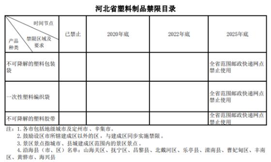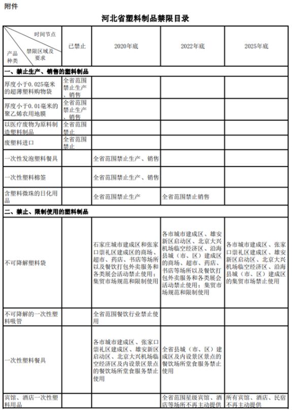 主要目標 到2020年底,率先在省會石家莊、張家口市崇禮區等部分地區和重點領域禁止和限制生產、銷售和使用一批塑料制品。 到2022年底,禁限范圍有序擴大,一次性塑料制品消費量明顯減少,替代產品有效推廣,資源化能源化利用比例顯著提高。 到2025年,塑料制品生產、流通、消費、回收利用和綠色替代等全過程管理制度基本建立,政府主導、企業主體、全民參與的共治體系基本形成,培育和推廣一批具地方特色的塑料污染防治典型模式,一次性塑料制品消費量進一步減少,塑料垃圾基本實現零填埋,替代產品開發應用水平進一步提升,塑料污染得到有效控制。 禁限名錄 1.禁止生產、銷售的塑料制品 全省范圍禁止生產、銷售厚度小于0.025毫米的超薄塑料購物袋,禁止生產、銷售厚度小于0.01毫米的聚乙烯農用地膜。禁止以醫療廢物為原料制造塑料制品。全面禁止廢塑料進口。 到2020年底,全省范圍禁止生產、銷售一次性發泡塑料餐具、一次性塑料棉簽;禁止生產含塑料微珠的日化用品。到2022年底,全省范圍禁止銷售含塑料微珠的日化用品。 2.禁止、限制使用的塑料制品 、俨豢山到馑芰洗 到2020年底,石家莊市城市建成區和張家口市崇禮區建成區的商場、超市、藥店、書店等場所以及餐飲打包外賣服務和各類展會活動,禁止使用不可降解塑料袋,集貿市場規范和限制使用不可降解塑料袋。 2022年底,實施范圍擴大至各市(含定州、辛集市,下同)城市建成區和雄安新區啟動區、北京大興機場臨空經濟區、沿?h城(市、區)建成區。 到2025年底,上述區域的集貿市場禁止使用不可降解塑料袋。鼓勵有條件的地方,在城鄉結合部、鄉鎮、農村地區集市等場所停止使用不可降解塑料袋。 、谝淮涡运芰喜途撸 到2020年底,全省范圍餐飲行業禁止使用不可降解的一次性塑料吸管;各市城市建成區、張家口崇禮區建成區、雄安新區啟動區、北京大興機場臨空經濟區及內設景區景點的餐飲場所堂食服務,禁止使用不可降解的一次性塑料餐具。 到2022年底,全省縣城(市、區)建成區及內設景區景點的餐飲場所堂食服務,禁止使用不可降解的一次性塑料餐具。 到2025年,各市、雄安新區餐飲外賣領域不可降解一次性塑料餐具消耗強度下降30%。 、圪e館、酒店一次性塑料用品: 到2022年底,全省范圍星級賓館、酒店等場所不再主動提供一次性塑料用品。 到2025年底,實施范圍擴大至所有賓館、酒店、民宿。 、劭爝f塑料包裝: 自2021年起,全省郵政快遞網點使用不可降解塑料袋(帶)比例每年下降20%。 到2025年底,全省范圍郵政快遞網點禁止使用不可降解的塑料包裝袋、塑料膠帶、一次性塑料編織袋等。