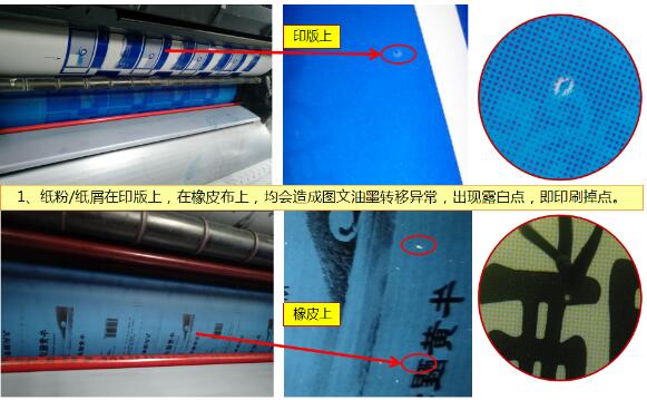 膠印過程中的印刷掉點(以下簡稱:印刷掉點)問題,是一個長期困擾印刷廠的工藝故障,印刷掉點造成的不良品占據整個印刷損耗的絕大部分。 通常描述的印刷掉點會更寬泛,即紙張印刷面的圖文承印部分在轉印時出現的漏 空現 象(單色或多色漏空)。包括有異物掉到印刷區域,承印物(紙張)或轉印物(印版、橡皮布)出現壓傷、破損等情況。我們的技術人員根據多年實戰經驗總結印刷掉點產生的原因及改善措施如下:
