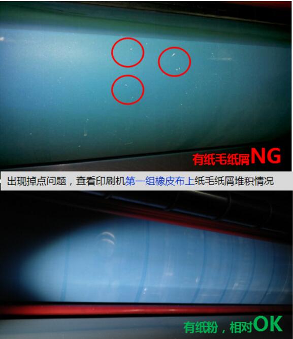 圖5:分切機牽引輥易黏附異物造成周期性壓傷 所以,不同的分切機分切質量會存在一定的差異性,不同松厚度的紙張分切適性也會存在差異,客戶應根據自己的設備性能、紙種搭配做好分切規劃、設備保養及分切品質檢查。 在此還需說明的一點是,如果使用平切機(即切紙機)修邊或規格切小,應注意平切后的端面紙毛紙屑情況,發現問題應及時調整或更換刀具,包括壓力的調整,切刀及膠條的更換。另外,平切時應注意觀察紙垛最上面一張紙的紙面,如發現有較多紙毛紙屑,應及時將其移除或拿掉。平切機周邊在使用風扇時,注意不要對著紙垛橫向吹風。 04、紙毛紙屑在不同位置導致的不同掉點形態 在印刷過程中,紙張直接與橡皮布接觸,不與印版接觸。由于橡皮布又與印版直接接觸,加上油墨的粘性,所以紙張上的紙毛紙屑,大部分先轉移到橡皮布上,進而轉移到印版、甚至膠輥上。下面讓我們來看一看,當紙毛紙屑在橡皮布及印版上時,所表現的不同印刷掉點形態,參考下圖。