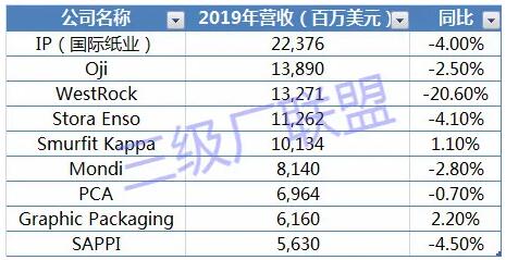2019年海外領先紙包裝企業的業績均產生了不同程度下滑。從營收來看,前十大紙包裝企業僅Smurfit Kappa和Graphic Packaging保持了正增長,其余皆為負數,其中WestRock2019年營收132.71億美元,同比下滑20.6%,創2019年營收最大跌幅。