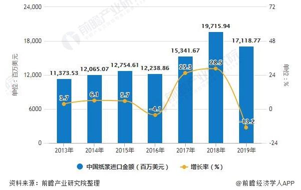2019年全年中國紙漿進口量超2700萬噸 據中國海關總署統計數據顯示,2018年中國紙漿進口數達到了2479萬噸,累計增長4.5%。截止至2019年12月中國紙漿進口量為218萬噸,同比增長23.2 %。累計方面,2019年1-12月中國紙漿進口量達到2720萬噸,累計增長9.7%。 在進口金額方面,2018年中國紙漿進口金額達到了19715937千美元(19715.94百萬美元),累計增長28.5%。截止至2019年12月中國紙漿進口金額為1130607千美元(1130.61百萬美元)。累計方面,2019年1-12月中國紙漿進口金額達到17118772千美元(17118.77百萬美元),累計下降13.2%,進口均價為6293.67千美元/萬噸。 2013-2019年中國紙漿進口量統計及增長情況