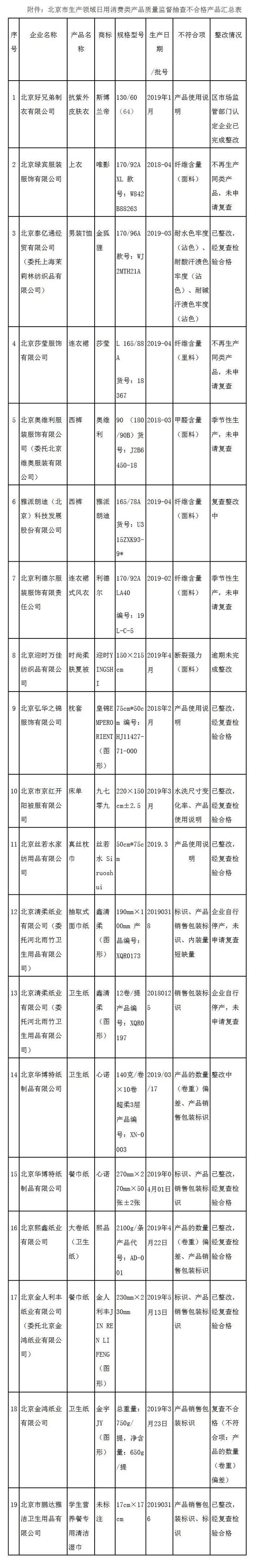 據(jù)北京市市場監(jiān)督管理局官網(wǎng)4月17日通報(bào),該局近期依法對本市生產(chǎn)領(lǐng)域服裝、玩具等9種日用消費(fèi)類產(chǎn)品開展了質(zhì)量監(jiān)督抽查,依據(jù)相應(yīng)產(chǎn)品質(zhì)量監(jiān)督抽查方案和相關(guān)標(biāo)準(zhǔn),檢出1批次兒童服裝、6批次成人紡織服裝、4批次床上用品和8批次紙及紙制品不合格。 對于抽查發(fā)現(xiàn)的不合格產(chǎn)品生產(chǎn)企業(yè),北京市市場監(jiān)督管理局已責(zé)成相關(guān)區(qū)市場監(jiān)管部門依法進(jìn)行查處。除個(gè)別企業(yè)外,繼續(xù)生產(chǎn)的企業(yè)已按要求進(jìn)行了整改,部分完成整改的企業(yè)經(jīng)復(fù)查檢驗(yàn)合格。 北京金鴻紙業(yè)有限公司整改后生產(chǎn)的“金宇JY(圖形)”牌110mm×106mm/節(jié)(三層)型高級衛(wèi)生紙(產(chǎn)品編號:JY-8937)經(jīng)復(fù)查檢驗(yàn)仍不合格。