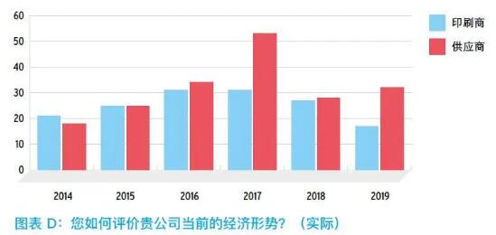 如果查看各區域隨時間的變化(圖表 C),可以發現:北美在過去七年里一直表現活躍;歐洲在2018 年之前呈現穩定增長;其他地區逐漸衰退,只有非洲今年呈現了令人振奮的增長態勢。各地區的供應商都懷著相同的隱憂,雖然相較于去年,他們對非洲、亞洲和中東地區抱持著更樂觀的信心,但仍然以比印刷商更大的幅度調低了明年的業績預測。 全球經濟信心隨時間的變化 樂觀與悲觀百分比凈差值