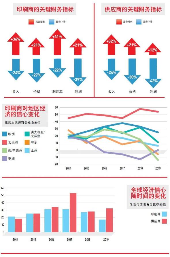 歡迎閱讀第 7 份 drupa 全球趨勢報告執行摘要。這一系列報告非常獨特,主要跟蹤全球七大地區和主要市場領域的關鍵經濟和市場發展狀況。2019 年 11 月(即冠狀病毒疫情爆發前的調查有近八百人參與,涵蓋大多數地區和市場。在此我們由衷地感謝由 2016 年展會的印刷商和參展商組成的 drupa 專家小組。 我們分別向印刷商和供應商分發了一份不同的調查問卷,其中有一些相同的問題,也有一些與每個群體直接相關的具體問題。此次調查共有 581 家印刷商參與,來自歐洲的占微弱多數(353 家),其余來自全球各地,非常具有代表性。供應商的數量明顯較少,但很高興有 189 名供應商參與,其中 119 人來自來自歐洲,同時也很好地覆蓋了其余地區。 調查結果顯示,人們在那時仍保持著樂觀的經濟信心,但態度明顯更加謹慎。發達經濟體非常忌憚貿易戰爭所帶來的威脅,新興經濟體則非常擔心腐敗和政治動蕩所造成的影響。雖然環保減塑活動對有些人來說意味著問題,但是對另一部分人來說卻代表著機遇,因此印刷包裝行業仍在持續增長。毫無疑問,從事出版印刷,以及或多或少涉及商業印刷的人都會對包裝和功能性印刷行業的增長機遇表示羨慕。 在撰寫本文時,冠狀病毒疫情的傳播規模和持續時間尚未可知,但其影響無疑是巨大的,這一點可以從 drupa 展會將延期至 2021 年 4 月的決定中得到印證。但是,無論您服務于哪個市場,在什么樣的社會經濟環境下運營,從調查結果來看,對創新的需求都至關重要。人們對印刷的需求會不斷改變,只有那些了解并能適應這些改變的印刷商和供應商才會蓬勃發展。 2019年drupa印刷商經濟信心指標 樂觀與悲觀百分比凈差值