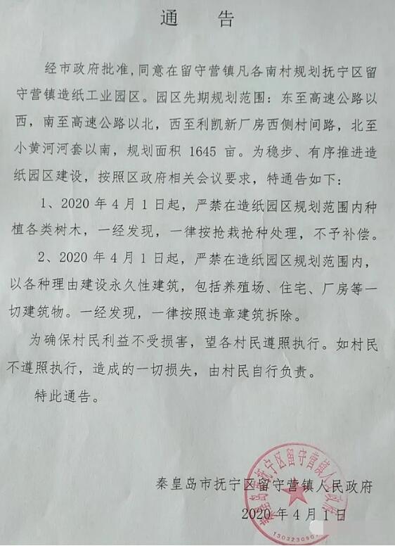 留守營(yíng)鎮(zhèn)造紙園區(qū)的初步規(guī)劃 2020年4月1日,撫寧區(qū)留守營(yíng)鎮(zhèn)人民政府的一紙通告揭開了留守營(yíng)工業(yè)園建設(shè)的初步規(guī)劃。據(jù)通告顯示,園區(qū)先期規(guī)劃范圍:東至高速公路以西,南至高速公路以北,西至利凱新廠房西側(cè)村間路,北至小黃河河套以南,規(guī)劃面積1645 畝。 為穩(wěn)步、有序推進(jìn)造紙園區(qū)建設(shè),按照區(qū)政府相關(guān)會(huì)議要求: 2020年4月1日起,嚴(yán)禁在造紙園區(qū)規(guī)劃范圍內(nèi)種植各類樹木,一經(jīng)發(fā)現(xiàn),一律按搶栽搶種處理,不予補(bǔ)償。 2020年4月1日起,嚴(yán)禁在造紙園區(qū)規(guī)劃范圍內(nèi),以各種理由建設(shè)永久性建筑,包括養(yǎng)殖場(chǎng)、住宅、廠房等一切建筑物。一經(jīng)發(fā)現(xiàn),一律按照違章建筑拆除。
