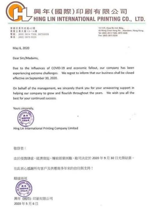 五一長假后的第一天,又一家老牌的港資印刷企業(yè)宣布結業(yè)了!新冠疫情引發(fā)的全球性經濟衰退,正將越來越多的人們甩離正常軌道,前浪失業(yè)了,后浪們何去何從? 近日,在珠三角享有盛譽的老牌港企興年印刷宣布光榮結業(yè),導致這家在大陸穩(wěn)健運營將近三十年的企業(yè)終止運營的原因是經濟原因和新冠疫情。