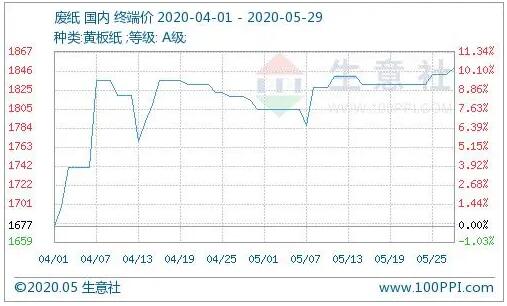 據(jù)生意社數(shù)據(jù)顯示,截止5月29日,廢紙市場(chǎng)A級(jí)收購(gòu)均價(jià)為1850元/噸,與5月21日均價(jià)1831.43元/噸的均價(jià)相比,上調(diào)19元/噸,上漲1%;與月初(5月1日)1804.29元/噸的均價(jià)相比,上調(diào)46元/噸,上漲2.53%。 瓦楞紙市場(chǎng)近期整體穩(wěn)中小幅上行,140g瓦楞原紙參考出廠價(jià)在2850-3150元/噸(含稅)附近。 廢紙市場(chǎng)行情分析 五月,我國(guó)國(guó)廢市場(chǎng)可謂“跌宕起伏”。直至5月28日,根據(jù)對(duì)國(guó)廢A級(jí)黃廢的數(shù)據(jù)監(jiān)測(cè)顯示,月初至今,市場(chǎng)雖跌宕起伏,但整體走勢(shì)上行為主。