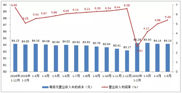 圖3:印刷業虧損面 2020年1-5月,印刷業營業收入利潤率為5.4%。圖4可見,與1-4月的4.98%相比,處于持續提升進程,也高于全部工業5%的平均利潤率水平。 2020年1-5月,印刷業每百元營業收入中的成本為84.14元,與1-4月的數值相同,略低于全部工業84.77元的平均水平。