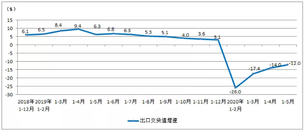 圖4:印刷業累計營業收入利潤率與每百元營業收入中的成本 04、資產質量分析 2020年5月末,印刷業規模以上企業的資產負債率為46.11%。相比上月的45.78%,略有上升。而與5月末全部工業56.9%的資產負債率相比,印刷企業的負債水平整體較低。 5月末,印刷業規模以上企業的應收賬款平均回收期為64.17天。相比4月末的66.1天,又減少近2天。但相比全部工業的應收賬款平均回收期58.8天,印刷企業的數字偏高。 5月末,印刷業規模以上企業的產成品存貨周轉天數為20.9天,相比4月末21.6天,存貨周轉速度又有所加快。但與去年底16.2天相比,仍處于復產恢復期。 05、出口交貨值分析 2020年1-5月,印刷業出口交貨值同比下降12%,高于營業收入同比下降速度(10.8%)。這意味著,內需市場對印刷行業的支撐性,要好于海外市場。當前,境外疫情仍在延續,出口前景也依然面臨比較大的不穩定性和不確定性。就印刷企業尤其外貿印刷企業而言,采取兩條腿走路,盡快在內需市場找到業務支撐點,是應對今年艱難時局的兩全之策。