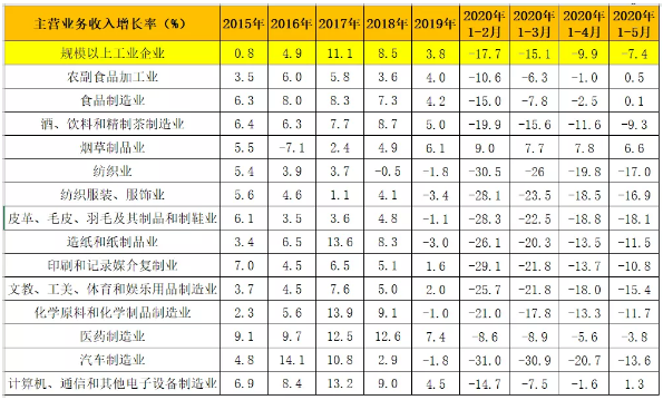 圖6:部分行業生產者出廠價格指數(上年同月=100) 07、部分行業走勢分析 表1顯示41個分行業中,部分與印刷業有密切關聯行業的主營業務收入增長情況。這些行業多數是印刷業所服務的客戶行業,也有造紙等上游行業。總體而言,幾乎所有行業的主營業務收入1-5月累計增速,均比上月情況有所好轉,但不同行業間的冷暖差異越來越大。