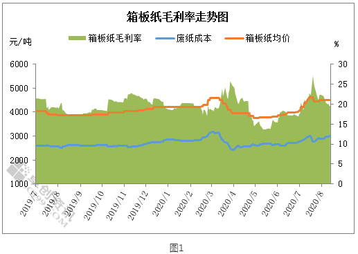 近一段時間以來,國內箱板紙與廢舊黃板紙價格走勢呈現出一定的背離走勢。根據卓創資訊統計的國內箱板紙均價與廢舊黃板紙均價看,箱板紙價格弱勢下滑,而廢舊黃板紙價格則呈上漲格局。卓創資訊監測的箱板紙毛利率數據顯示,箱板紙毛利率已連續三周下行,紙企利潤空間在不斷被壓縮。 從包裝原紙的情況看,在6、7月份的漲價刺激下,國內二級廠進行了大量的備貨。不過由于終端需求相對緩慢,二級廠目前還是以消耗庫存為主。根據部分紙企反饋的信息看,現在紙企的訂單量萎縮的較為嚴重。