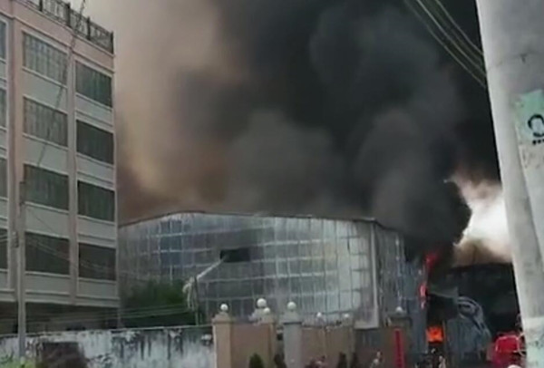 從圖片可以看到,現(xiàn)場濃煙滾滾,黑煙直沖云霄,消防人員正在開展救援。