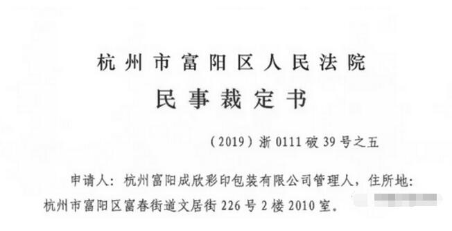 近日,杭州市富陽區人民法院作出《民事裁定書》,裁定宣告杭州富陽成欣彩印包裝有限公司破產。該企業成立于2008年,經營范圍包括紙制品加工,紙箱、紙盒及包裝材料銷售等。 據了解,從2018年起,杭州富陽成欣彩印包裝有限公司就面臨資金緊張的問題。據天眼查信息顯示,該企業曾被多家供應商及金融機構告上法庭,公司負責人也曾被限制消費。 2019年12月份,杭州市富陽區人民法院裁定受理杭州富陽成欣彩印包裝有限公司破產清算案,并于同日指定浙江楷立律師事務所擔任杭州富陽成欣彩印包裝有限公司管理人。
