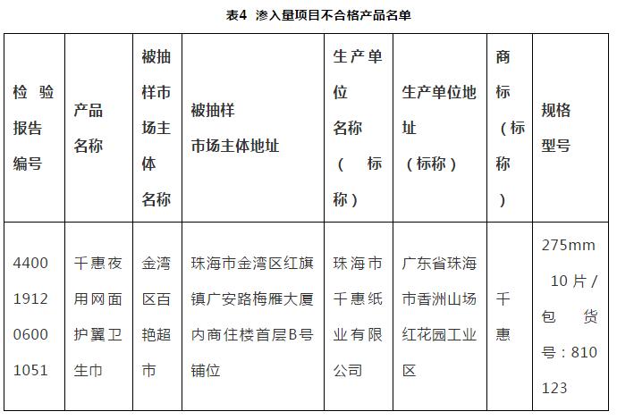(四)滲入量:本次抽查判定1款產品滲入量項目不合格。該項目主要考核衛生巾產品的滲透性。該項目不合格,產品就失去了使用價值,在使用過程中會發生漏液現象。滲入量項目不合格產品名單見表4。