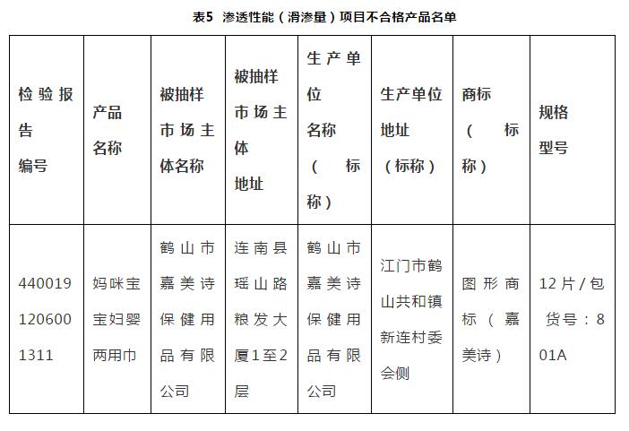 (五)滲透性能(滑滲量):本次抽查判定1款產品滲透性能(滑滲量)項目不合格。該項目主要是考核產品表面的親液性。該項目不合格,尿液從紙尿褲(片、墊)的表面流過時只沿其表面流淌而不被吸入,使用過程中無法保持皮膚的干爽。滲透性能(滑滲量)項目不合格產品名單見表5。