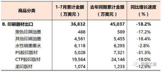 同期,國內印刷器材出口3.68億美元,同比下降18.2%(參見表7)。其中,黑色印刷油墨1274千克,488萬美元(同比下降17.2%);其他印刷油墨10899千克,4561萬美元(同比下降16.4%);水性噴墨墨水8749千克,6118萬美元(同比下降2.8%);PS膠印版材2248.96萬平方米,5028萬美元(同比下降31.3%);CTP膠印版材7453.51萬平方米,1.96億美元(同比下降19.0%);柔印版材25.60萬平方米,1074萬美元(同比下降12.9%)。 表7 2020年1-7月國內印刷器材出口統計