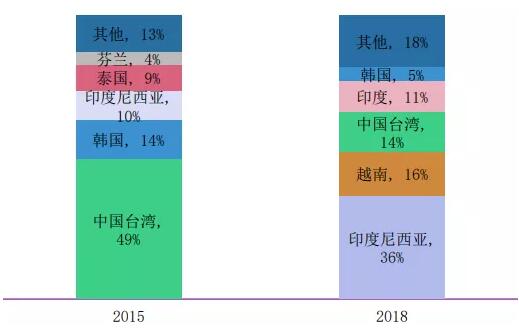 2015&2018年瓦楞紙進(jìn)口來源地(來源:RISI) 這讓中國的原紙進(jìn)口市場異常復(fù)雜。依靠高緯度針葉林的高質(zhì)量纖維優(yōu)勢,歐美國家的全木漿牛卡一直是專供于某些大品牌客戶,在這一類市場占據(jù)穩(wěn)定而有限的市場份額;對標(biāo)國內(nèi)一線紙廠的瓦楞紙,根據(jù)克重分層,則或來源于俄羅斯,改造新聞紙機(jī)生產(chǎn)。或來自東南亞,此外還有用量不大的掛面箱板紙,也是多來自于東南亞,少部分歐洲。澳洲除了出口少量低克重全木漿牛卡外,還大量出口芯紙(施膠)。 然而最值得關(guān)注的還是東南亞市場。近年來,中國從東南亞進(jìn)口的原紙數(shù)量越來越大,特別是70-90g的瓦楞紙,一度在部分沿海二級廠呈泛濫之勢。當(dāng)然,口碑分化也很厲害,這里面的差距大到甚至讓人看顏色聞味道一眼就能區(qū)分的程度。 然而不管怎么說,在絕對價格優(yōu)勢下,仍然還會有部分包裝企業(yè)能夠接受。我們可以這樣理解,東南亞的原紙正在某種程度上復(fù)制中國紙企曾經(jīng)走過的路。“摸著中國過河”,憑借價格優(yōu)勢,來自東南亞新興市場的進(jìn)口紙異軍突起。 2.轉(zhuǎn)移:新興市場崛起原因分析 說起東南亞市場,又不得不提到中國臺灣,以及臺灣工業(yè)用紙三大廠,正隆、榮成和永豐余,這也是前面一章沒有提到的另一個重要進(jìn)口紙來源。 自上世紀(jì)70年代末我國內(nèi)地實(shí)行對外開放以來,香港和臺灣就一直是內(nèi)地最主要的外來投資者。在改革開放后相當(dāng)長的一段時間,港臺投資商給內(nèi)地帶來資金、技術(shù)的同時,也帶來了現(xiàn)代企業(yè)的經(jīng)營理念和管理經(jīng)驗(yàn),伴隨著制造業(yè)的轉(zhuǎn)移,大量制造業(yè)產(chǎn)能被搬到了內(nèi)地。 繁榮的制造業(yè)衍生了海量的包裝用紙需求。在21世紀(jì)初期,臺灣三大紙廠快馬加鞭、“揮師大陸”,在華東、華北及華中等地區(qū)大量投資建廠,一度成為中國包裝造紙領(lǐng)域的重要力量。 然而風(fēng)水輪流轉(zhuǎn),隨著環(huán)保壓力、用工成本增大,以及外廢限令等問題的觸發(fā),臺灣的造紙企業(yè)開始了轉(zhuǎn)移之旅,逐漸把大陸當(dāng)做一個銷售市場。其主要的轉(zhuǎn)移目的地,除了臺灣本省之外,另一個主要選擇就是東南亞地區(qū)了。近年來,臺資背景的造紙企業(yè)不斷加大在東南亞的投入,大幅度擴(kuò)建、新建造紙產(chǎn)能。 這一系列操作估計很多老板都很眼熟,比如說制鞋領(lǐng)域,從2018年第四季度開始,臺灣制鞋三雄寶成、豐泰及鈺齊,不約而同持續(xù)加強(qiáng)非大陸地區(qū)擴(kuò)產(chǎn)或營運(yùn),然后將大量產(chǎn)能轉(zhuǎn)移到東南亞,特別是越南、泰國等國家。在紡織服裝、玩具領(lǐng)域,也有大量類似的情形。 3.新戰(zhàn)場:發(fā)生在東南亞的中國紙企角逐 近八年亞洲其它國家和地區(qū)包裝用紙需求量年復(fù)合增長率在3%左右,其中越南、印度增長最快;而在出口量方面,越南、中國臺灣、印尼、印度的出口量增長最快。從這一點(diǎn)看,臺資企業(yè)將產(chǎn)能轉(zhuǎn)移到東南亞的選擇“英明無比”。 但是,看上東南亞的不僅是臺資企業(yè),中國紙企也在東南亞展開了競逐。玖龍越南分公司已經(jīng)成為玖龍九大造紙基地之一年產(chǎn)能為45萬噸;理文造紙是國內(nèi)最早在國外投資建廠的企業(yè),2007年就在越南開工建設(shè)了第一家工廠。山鷹、太陽紙業(yè)、景興等,也都在東南亞有大量投資進(jìn)行布局。 早在2018年,來自越南的再生箱板紙和瓦楞紙在中國進(jìn)口來源地中占比就分別達(dá)到了10%和16%,隨著更多企業(yè)布局越南,這一比例逐年增加。 從這個角度,東南亞國家的制造業(yè)(包括造紙)在“摸著中國過河”,但中國的企業(yè)又何嘗不是在“借雞生蛋”? 造紙企業(yè)選擇東南亞的原因,除了短期內(nèi)的人工成本優(yōu)勢外,最根本就是東南亞國家的環(huán)保政策優(yōu)勢了。從2017年國內(nèi)開始施行廢紙進(jìn)口限令以來,國內(nèi)優(yōu)質(zhì)造紙原料渠道受限,東南亞地區(qū),特別是越南憑借地理優(yōu)勢,成為了造紙廠的最佳選擇。通過在越南建廠,就近使用外廢生產(chǎn)原紙,不僅可以緩解國內(nèi)原料需求壓力,還可以競爭越南本地需求市場。近十年來,越南的包裝用紙需求量年復(fù)合增長率持續(xù)保持在10%以上,但絕大部分市場,都基本被中國(包括臺灣省)所壟斷。 換句話說,雖然看起來進(jìn)口紙的數(shù)量在不斷增大,但我們能看到的很多進(jìn)口紙,可能還是中國紙企生產(chǎn)的,只不過地區(qū)變了(甚至在某種程度上,它還稀釋了美國、澳大利亞、俄羅斯等國家地區(qū)的比例)。 4.新時代:包裝人如何應(yīng)對可能的市場萎縮 一路深挖下來,我們已經(jīng)基本知道近年來進(jìn)口紙市場突變的根源了。然而,討論這些對包裝企業(yè)有什么意義呢?回到最開始的兩個話題。 源源不斷的進(jìn)口紙,讓國內(nèi)原紙價格走向出現(xiàn)了一定的變數(shù),這種影響到底多大?隨著國外新興市場復(fù)制中國模式,讓中國制造業(yè)轉(zhuǎn)移、帶動包裝需求減少,讓中國包括包裝產(chǎn)業(yè)的企業(yè)出現(xiàn)萎縮危機(jī),中國企業(yè)該怎么反思? 據(jù)中國造紙協(xié)會調(diào)查資料,2019 年全國紙及紙板生產(chǎn)企業(yè)