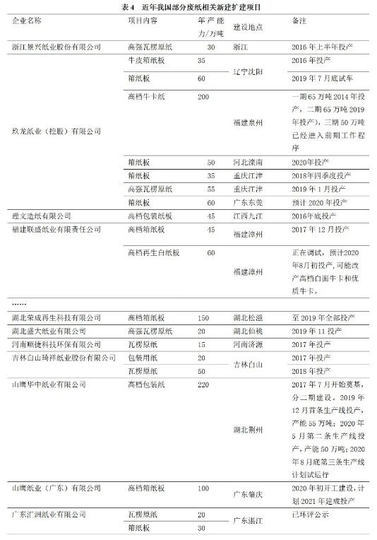2019年我國以廢紙為主要原料的4個品種的合計生產量和合計消費量同比都有所增長,占紙和紙板總生產量及總消費量的比例與2018年相比變化都不大,不足0.5個百分點。 04、近年廢紙相關項目建設情況 近年來,以廢紙為主要原料的新上項目和計劃新上項目較多,規模也較大。其中,包裝紙、瓦楞原紙、箱紙板等成為了這幾年我國產能增量較大的產品。 近兩年由于中國限制廢紙進口政策、國際及國內經濟形勢的不斷變化,一些計劃新上項目出現延期或更改等情況,也有很多大型造紙企業投資海外。如以玖龍紙業、太陽紙業、山鷹紙業、理文紙業等大型造紙企業為代表的一些中國造紙企業正在國外投建廢紙漿、包裝紙及紙板生產線,充分利用國際廢紙資源,其中一部分廢紙漿產品已以漿板形式出口至中國;另一部分將直接加工成包裝類紙及紙板,投放中國或國際市場。 如根據公開資料顯示,理文造紙已在馬來西亞、越南投產125萬噸/年箱紙板和瓦楞原紙、95萬噸/年再生漿產能;玖龍紙業已在越南、美國分別投產50萬噸/年箱紙板和瓦楞原紙、22萬噸/年再生漿產能;山鷹紙業已在東南亞、美國投產了42萬噸/年再生漿產能;臺灣正隆紙業也已在越南投產了30萬噸/年箱紙板和瓦楞原紙產能。 由此可見,以往以進口廢紙形式存在的廢紙原料一部分將改變供貨模式,以廢紙漿板或者成品紙及紙板的形式進口至中國,但從長遠來看,以廢紙漿進口的供貨模式的經濟性、實用性等還有待驗證。 此外,據不完全統計,2019年以來國內市場實際投放的以廢紙為原料的新產能超過1000萬噸以上。表4列出了近年我國部分廢紙相關新建擴建項目的跟蹤情況。