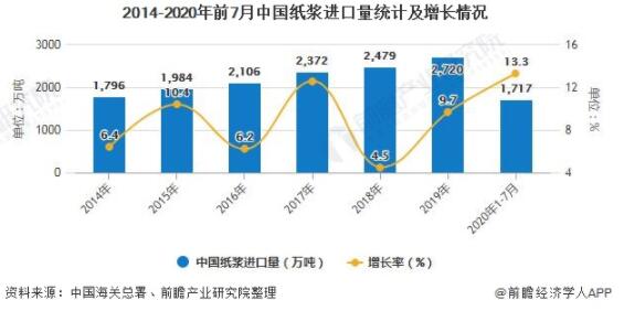 2020年1-7月中國紙漿進口量累計超1700萬噸