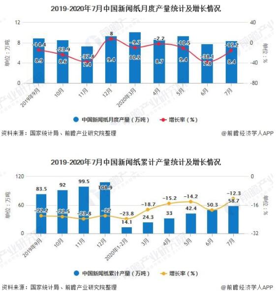 據國家統計局數據顯示,2019年全年中國新聞紙產量達到了108.85萬噸,累計下降22%。截止至2020年7月中國新聞紙產量為8.4萬噸,同比下降15.2%。累計方面,2020年1-7月中國新聞紙累計產量達到58.7萬噸,累計下降12.3%。