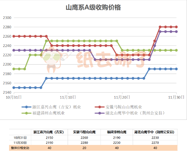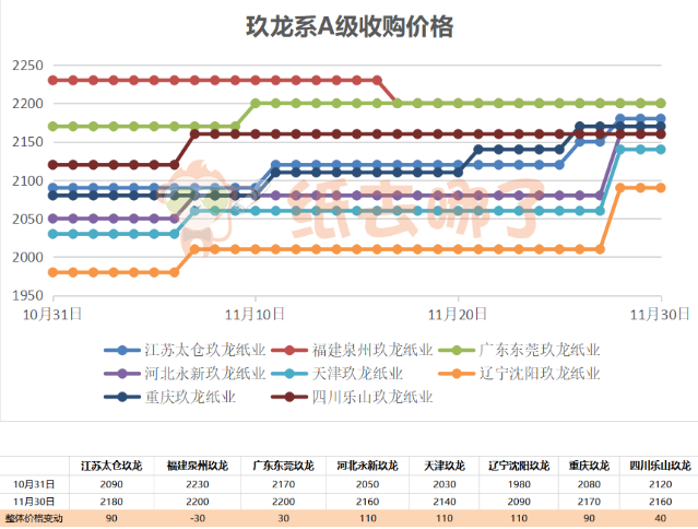 這一政策的出現無疑成為刺激本輪國廢價格回暖的重要因素,消息發出后的短短幾天,國廢價格就迎來了一波上漲大潮,廢紙指數從11月24日的2006.22,到11月30日的2020.63,漲幅達0.72%。 廢紙在“外廢即將徹底清零”的政策烘托下競爭愈發激烈,行業集中度或將進一步提升。而廢紙價格的上揚,也從原料端支撐了原紙價格,能從一定程度上遏制或減緩原紙價格下跌的趨勢。 華東地區以山鷹、理文、玖龍三大規模紙企領漲,以下為三大紙廠本月廢紙走勢圖,從圖中可以看出,三大紙廠的紙價在月底前一周都有不同程度的上漲走勢,且漲勢不減。 山鷹系A級收購價格走勢