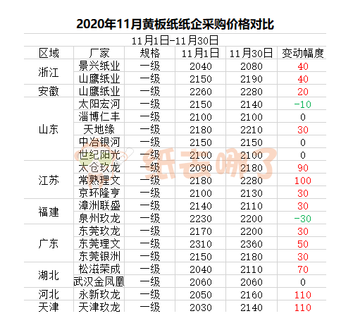 截至11月30日,玖龍系A級以福建和廣東玖龍同為最高,為2200元/噸;遼寧玖龍最低,為2090元/噸。 黃板紙價格走勢 以下為11月部分紙廠黃板紙采購價格對比。