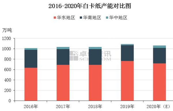 2016-2020年白卡紙新增產能仍以龍頭企業擴張和個別中小紙廠新增產能,另外頭部企業擴張以漿紙一體化布局為主。2016-2019年國內白卡紙CR4為80%-83%。2020年APP并購博匯順利推進,博匯單機產能有所提升,國內白卡紙CR3達到82.69%。近五年來新增產能主要集中在華東地區,2020年華東地區產能占國內市場的69.25%。2020年僅有河南新亞新增白卡紙年產能20萬噸。