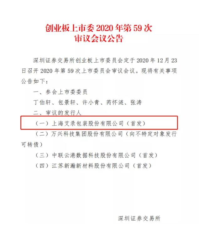 12月23日晚間,深交所官網發布的創業板上市委2020年第59次審議會議結果公告顯示,上海艾錄包裝股份有限公司(以下簡稱“艾錄股份”)的首發符合發行條件、上市條件和信息披露要求。  這意味著,2020年第六家新上市的包裝印刷企業誕生了!  資料顯示,艾錄包裝是少數掌握高品質工業用紙包裝產品和復合塑料包裝產品核心技術的國內企業之一,具備較強的技術研發能力。公司是“上海市高新技術企業”,曾先后被評為“上海市認定業技術中心”、“金山區企業技術中心”、“金山區專利工作試點單位”、“上海市科技小巨人企業”。 數據顯示,截至目前,艾錄股份先后獲得115項專利,其中20項發明專利、95項實用新型專利及外觀設計專利。公司的技術優勢為公司持續保持紙包裝行業領先地位提供了有力支撐,確保其能夠根據市場需求迅速地推出新產品,提高產品的附加值,增強公司議價能力。  目前艾錄股份服務于400余家客戶,以世界500強和行業龍頭為主。憑借優良的管理體系、先進和智能的生產能力、符合食品級和GMP標準的潔凈環境和長期穩定的質量控制能力、提供一體化包裝解決方案的能力,艾錄股份在行業內樹立里了良好的市場聲譽和品牌影響力。國內外龍頭企業的認可進一步證明艾錄股份的技術水平、產品質量、綜合服務能力已經具備國內外領先水準。  此次艾錄股份擬登陸創業板募集資金主要是投向“工業用環保紙包裝生產基地擴建項目”、“復合環保包裝新材料生產線技改項目”、“智慧工廠信息化升級改造項目”等。隨著募投項目的完成,將進一步提高艾錄股份包裝產品的生產能力、進一步豐富產品結構、提高自動化生產水平,為公司未來市場份額以及競爭實力的提升奠定基礎。  隨著艾錄上會成功,今年的上市包裝印刷企業已經達到六家!此前的五位分別是: 于9月10日創業板上市的龍利得智能科技股份有限公司, 于9月21日中小板上市的廣東天元實業集團股份有限公司, 于11月6日中小板上市的金富科技股份有限公司, 于12月11日上市的杭華油墨股份有限公司, 于12月22日上交所主板上市的森林包裝集團股份有限公司。