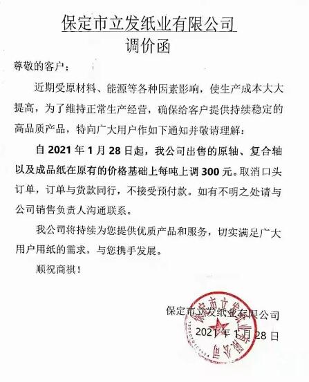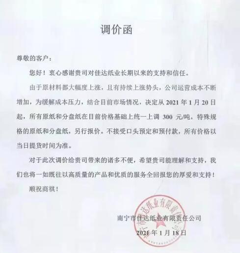廣東信達(dá)紙業(yè):自2021年1月27日起,我司原紙每噸提價(jià)300元。