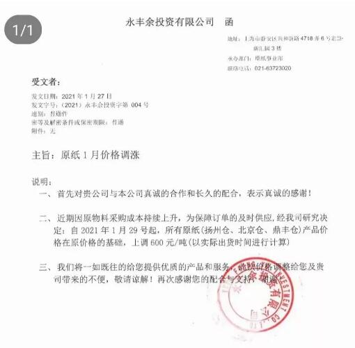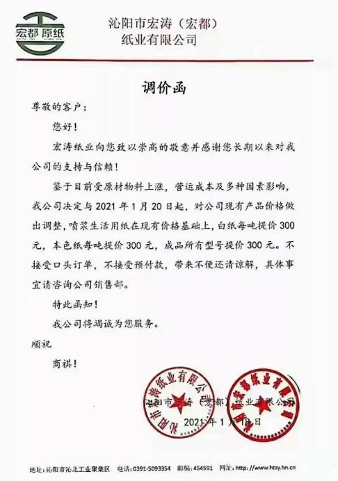 晨鳴集團(tuán):自2021年1月31日起,我司生活用紙?jiān)埫繃嵦醿r(jià)200元/噸;自2021年2月18日起,我司生活用紙?jiān)埫繃嵦醿r(jià)300元/噸;