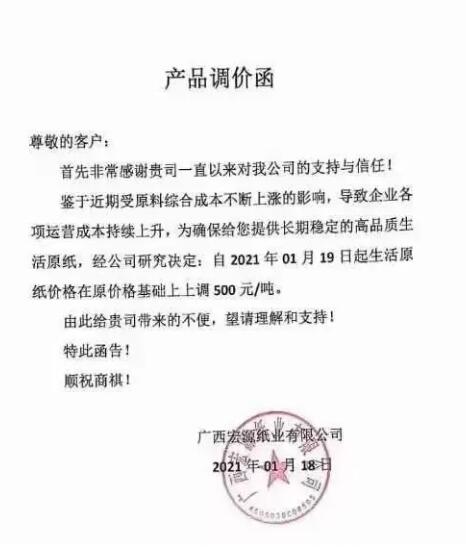 泰盛(江西)生活用品:1、自2021年2月18日起,在2月1日的價(jià)格政策基礎(chǔ)上上調(diào)漲400元/噸。2、自2021年3月1日起,在2月18日的價(jià)格政策基礎(chǔ)上上調(diào)漲300元/噸。