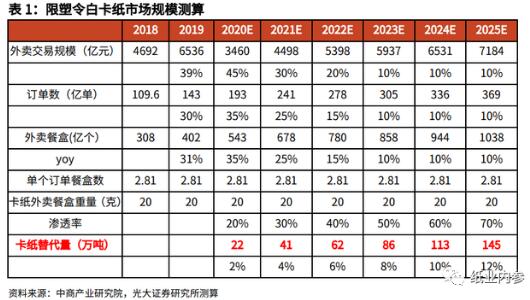 2、白卡紙漲價(jià)原因剖析,禁塑令無(wú)疑是最猛催化劑 1、原料木片采購(gòu)困難,尤其針葉木片多以進(jìn)口為主,自去年底開始木片采購(gòu)困難,據(jù)悉個(gè)別紙廠曾因木片采購(gòu)不到位導(dǎo)致產(chǎn)線停機(jī)。 2、原料紙漿價(jià)格一路拉漲,針葉漿現(xiàn)貨價(jià)格突破7000元沖擊8000元,成本面支撐強(qiáng)勁。 3、浙江富陽(yáng)地區(qū)白板紙廠1月24日左右全部停產(chǎn),部分白板紙訂單流向白卡紙企業(yè); 4、隨著禁塑令的深入推進(jìn),紙廠開始研發(fā)轉(zhuǎn)產(chǎn)無(wú)塑紙杯,同時(shí)“以紙代塑”概念下,紙品包裝備受追捧。因此規(guī)模紙企對(duì)于白卡紙行情依舊看好; 5、浙江寧波中華紙業(yè)搬遷在即,客戶將分流到其他紙廠,對(duì)2021年白卡紙供需再添利好。 白卡紙這一輪的暴漲,禁塑令無(wú)疑是其背后最猛催化劑,白卡紙?zhí)娲枨缶薮螅彩钱a(chǎn)業(yè)看好白卡紙基本面的最主要理由。 2020年,全國(guó)各省市陸續(xù)發(fā)布限塑令要求,餐飲行業(yè)首當(dāng)其沖。據(jù)光大證券測(cè)算,若2025年外賣盒白卡紙滲透率達(dá)到70%,則需要白卡紙需求量145萬(wàn)噸。
