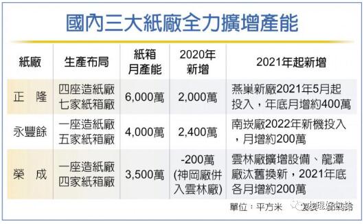 2021年一季度,紙箱供不應求現象接連上演。臺灣地區媒體于近期連發多篇報道稱,紙箱延遲交貨,3月份漲幅達15-20%。筆者從各渠道了解到,造成這種現象的原因主要有兩點,一是需求上升,二是紙箱廠缺工人和送貨司機。 臺灣地區紙箱缺貨,價格大漲 據臺媒“工商時報”消息,臺灣商總旗下網購電商業、農產品運輸業等產業,由于缺乏紙箱包裝,訂單難以出貨。尤其是電子行業,近期更是狂搶紙箱,超量備貨庫存,某電子大廠干脆進廠催貨,生怕出現有訂單卻無紙箱的尷尬現象。 恐慌性訂單涌現,令紙廠即便加班加點也來不及生產。報道稱,近期正隆等企業多達一成紙箱訂單來不及交貨;部分紙箱廠面對訂單爆發,延遲交貨7-10天;臺灣區紙器工業同業公會預估,紙箱延遲交貨現象,恐怕第三季之前都解決不了。 在需求大于供給的情況下,臺灣地區紙箱價格持續上漲。從2020年第四季度開始,紙箱廠加班加點滿足市場,微幅上調3%-5%。今年春節過后,廢紙、紙漿價格逐月上漲,包裝用紙上調15-20%,紙箱價格在此推動下,水漲船高。 值得一提的是,與大陸相似,即便原料成本不斷上升,但紙箱廠遇到有大量采購議價能力的客戶也很難漲價成功。不過,這種情況在3月份得到好轉,當地不少大型客戶點頭接受調漲計劃,漲幅達15-20%。 市場需求上升,企業擴充產能 筆者綜合臺灣各大媒體報道,發現造成當地紙箱缺貨的原因之一,便是市場需求大幅上升。據臺灣區紙器工業同業公會統計,去年紙箱產能逾23億平方米,較前年的21億平方米大幅成長近一成,是近年紙箱每年溫和成長2-3%的數倍。 紙箱需求上升,令臺灣地區的紙板生產也受到較大影響。當地媒體在一篇報道中稱,商總理事長許舒博向工業局了解到,當地不缺紙漿,而是缺紙板,永豐余、正隆與榮成三大企業雖按現有機組、勞力條件下,產能全開,紙板生產依然供不應求。 臺灣工業局表示,在過去,紙板廠產能一向穩定,但因外銷產品在農歷年前暢旺,而大量外銷產品又需要包裝,這就導致紙箱廠大量向紙板廠訂貨,整體出貨出貨延遲約三至五天。今年這波訂單,預計今年紙板廠新產能投產才會完全消化。 為此,當地相關企業紛紛加碼投資擴廠。僅以2021年為例,正隆紙業燕巢新廠將從5月份開始投入,年底月增約400萬平方米產能;榮成云林廠擴增設備、龍潭廠汰舊換新設備,月增各約200萬平方米產能,年底或可各增至400萬平方米產能。