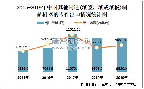 根據中國海關數據顯示:2019年1-12月中國其他制造(紙漿、紙或紙板)制品機器的零件進口數量為563.89噸,進口金額為2273.51萬美元;2019年1-12月其他制造(紙漿、紙或紙板)制品機器的零件出口數量為9820.33噸,出口金額為9051.91萬美元。