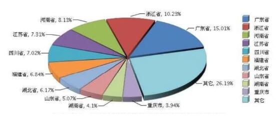 (2020年全國瓦楞紙箱行業月度產量及同比) 產量前十地區中,八個地區負增長 從各地區來看,2020年,瓦楞紙箱產品前十地區分別是廣東省、浙江省、河南省、江蘇省、四川省、福建省、湖北省、山東省、湖南省、重慶市。具體如下: 廣東省完成累計產量475.94萬噸,占總產量的15.01%; 浙江省完成累計產量324.52萬噸,占總產量的10.23%; 河南省完成累計產量257.71萬噸,占總產量的8.13%; 江蘇省完成累計產量231.83萬噸,占總產量的7.31%; 四川省完成累計產量222.51萬噸,占總產量的7.02%; 福建省完成累計產量217萬噸,占總產量的6.84%; 湖北省完成累計產量195.53萬噸,占總產量的6.17%; 山東省完成累計產量160.61萬噸,占總產量的5.07%; 湖南省完成累計產量129.94萬噸,占總產量的4.1%; 重慶市完成累計產量124.93萬噸,占總產量的3.94%。