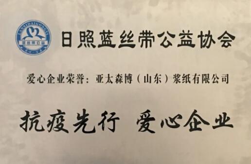 在2020年疫情防控期間,亞太森博第一時間就成立了工作小組,全力配合政府的防疫政策和指令。企業不僅自身實現了零感染、零停產,同時還積極整合優勢資源,無償向社會捐贈次氯酸鈉溶液1300多噸(原液,可按1:100兌成13多萬噸實用消毒液),惠及數百萬人次;在2020年2月份,口罩最緊缺的時期,亞太森博積極協調集團資源,千方百計采購到6萬只口罩于捐贈給日照市疫情防控一線,解了一線的燃眉之急;公司員工志愿者也積極行動起來,走訪慰問堅守在疫情防控一線的公安、交通、衛生防疫等執勤人員,送去消毒液、防疫器材和食品等物資,為抗擊疫情貢獻了企業力量。 公司先后被表彰為抗擊新冠疫情“愛心單位”、“2020企業公民防疫抗疫先鋒”、“疫情防控先進單位”。公司抗擊新冠疫情捐贈的部分實物、證書、票據也在中國華僑博物館展出陳列。