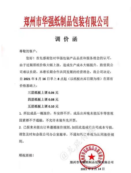 湖南龍發包裝有限公司 從2021年5月17日上午18點開始,紙板價格在現有價格基礎上上漲3%。  汕頭市萬豐紙品實業有限公司 從2021年5月15日上午8點開始,三層紙板每平方上漲0.03元/平方,四層紙板每平方上漲0.04元/平方,五層紙板每平方上漲0.05元/平方。